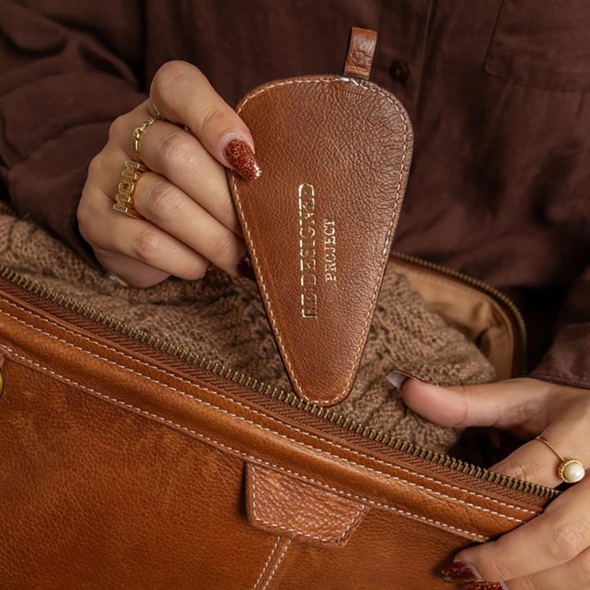 Il est fabriqué en cuir de vachette foulonné dont chaque peau est travaillée de manière unique afin de préserver le grain naturel du cuir brut. Après la teinture, une légère couche de cire est appliquée, offrant une finition lisse et douce, aux nuances uniques qui rendent chaque pièce singulière.