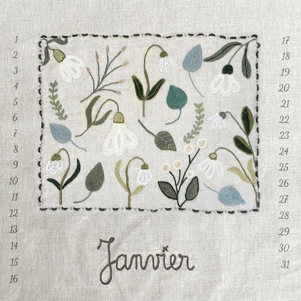 Tous les mois de cette année 2023, vous trouverez un nouveau kit vous permettant de broder une nouvelle page de votre calendrier perpétuel. En décembre prochain, vous aurez réalisé 12 broderies illustrées de délicates fleurs de saison. Feuillets, tenture, patchwork, à vous de le présenter de la manière qui vous plait le mieux !