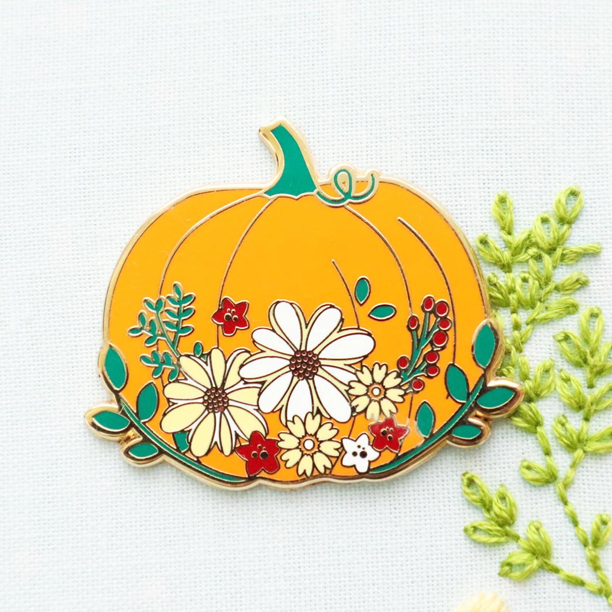 Joli porte-aiguille aimanté représentant une adorable citrouille fleurie.